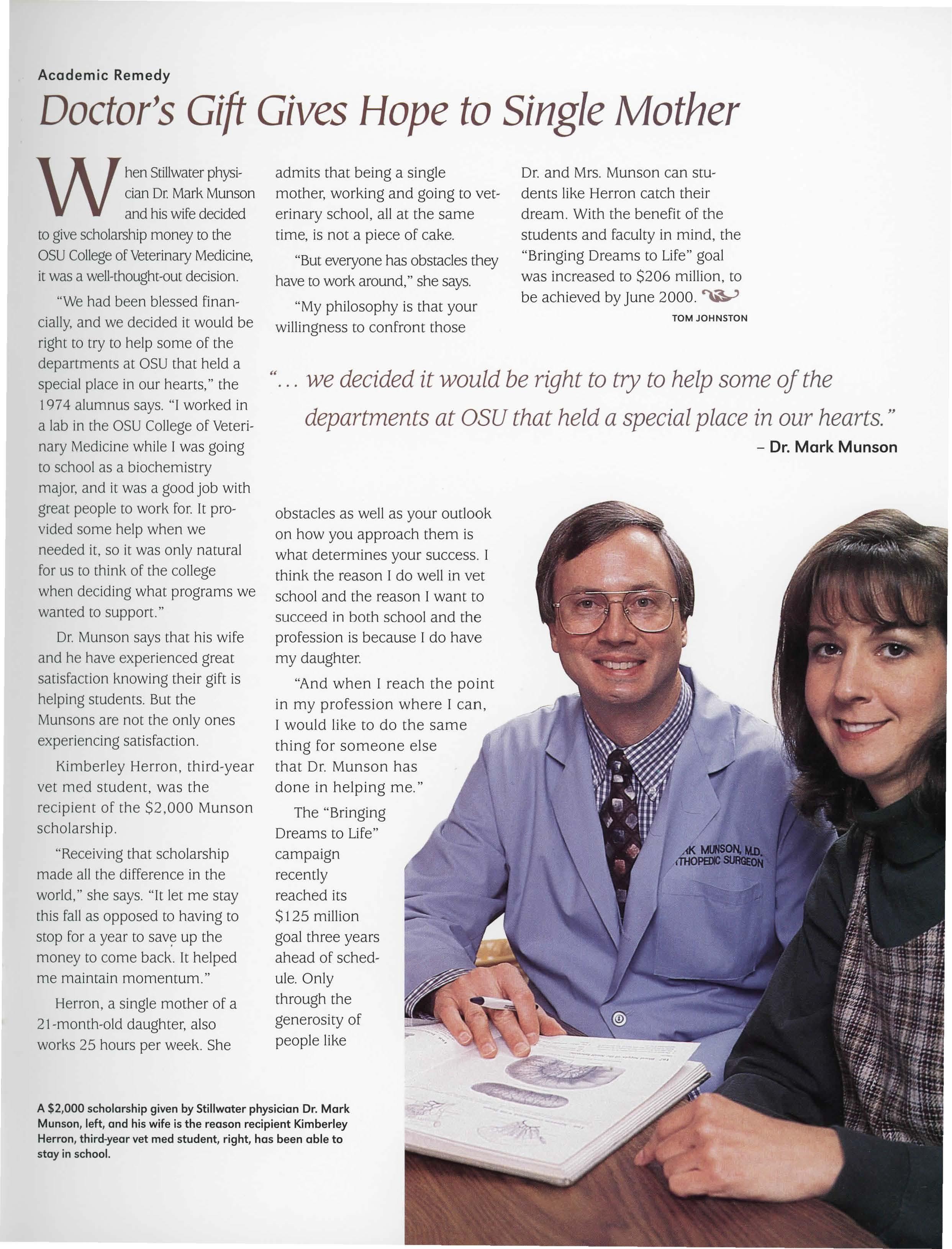 When Stillwaterphysician Dr. Mark Munson and his wife decided to give scholarshipmoney to the OSUCollegeof VeterinaryMedicine, it was a well-thought-outdecision.