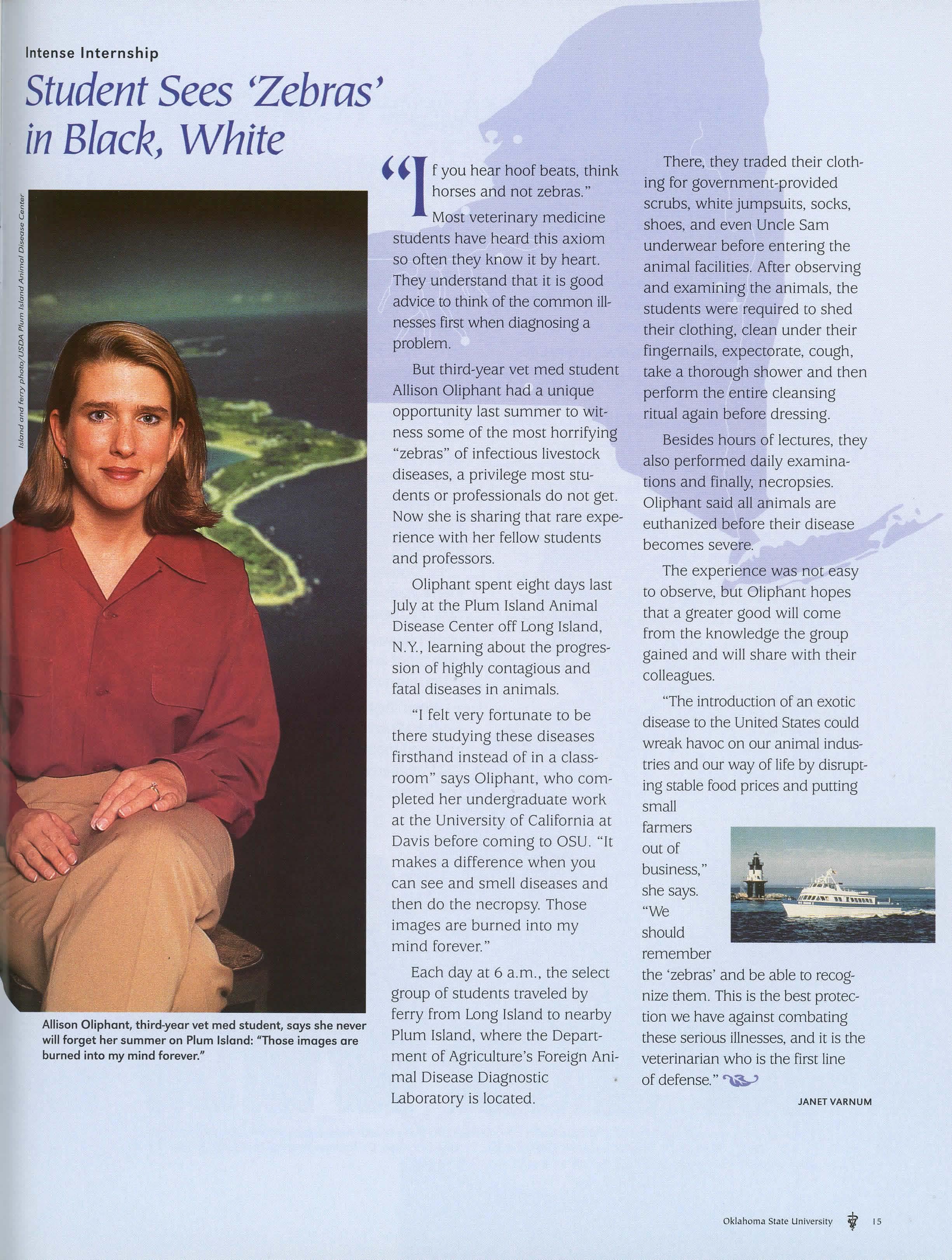 But third-year vet med student Allison Oliphant had a unique opportunity last summer to witness some of the most horrifying "zebras" of infectious livestock diseases, a privilege most students or professionals do not get. Now she is sharing that rare experience with her fellow students and professors.