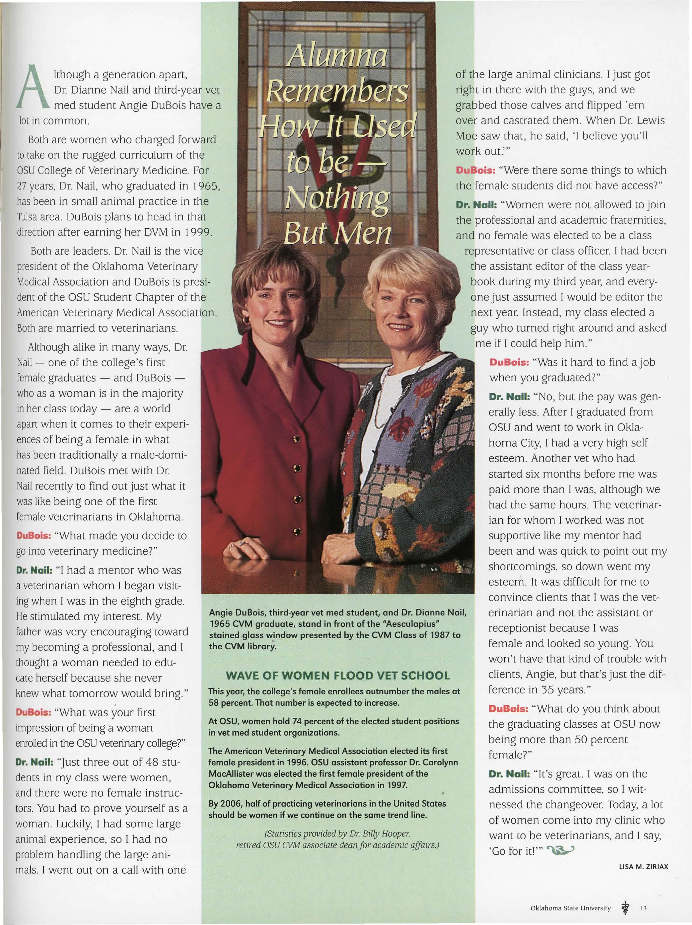 Although alike in many ways, Dr. Nail- one of the college's first femalegraduates - and DuBoiswhoas a woman is in the majority in her class today - are a world apartwhen it comes to their experiencesof being a female in what hasbeen traditionally a male-dominatedfield. DuBois met with Dr. Nailrecently to find out just what it waslike being one of the first femaleveterinarians in Oklahoma.