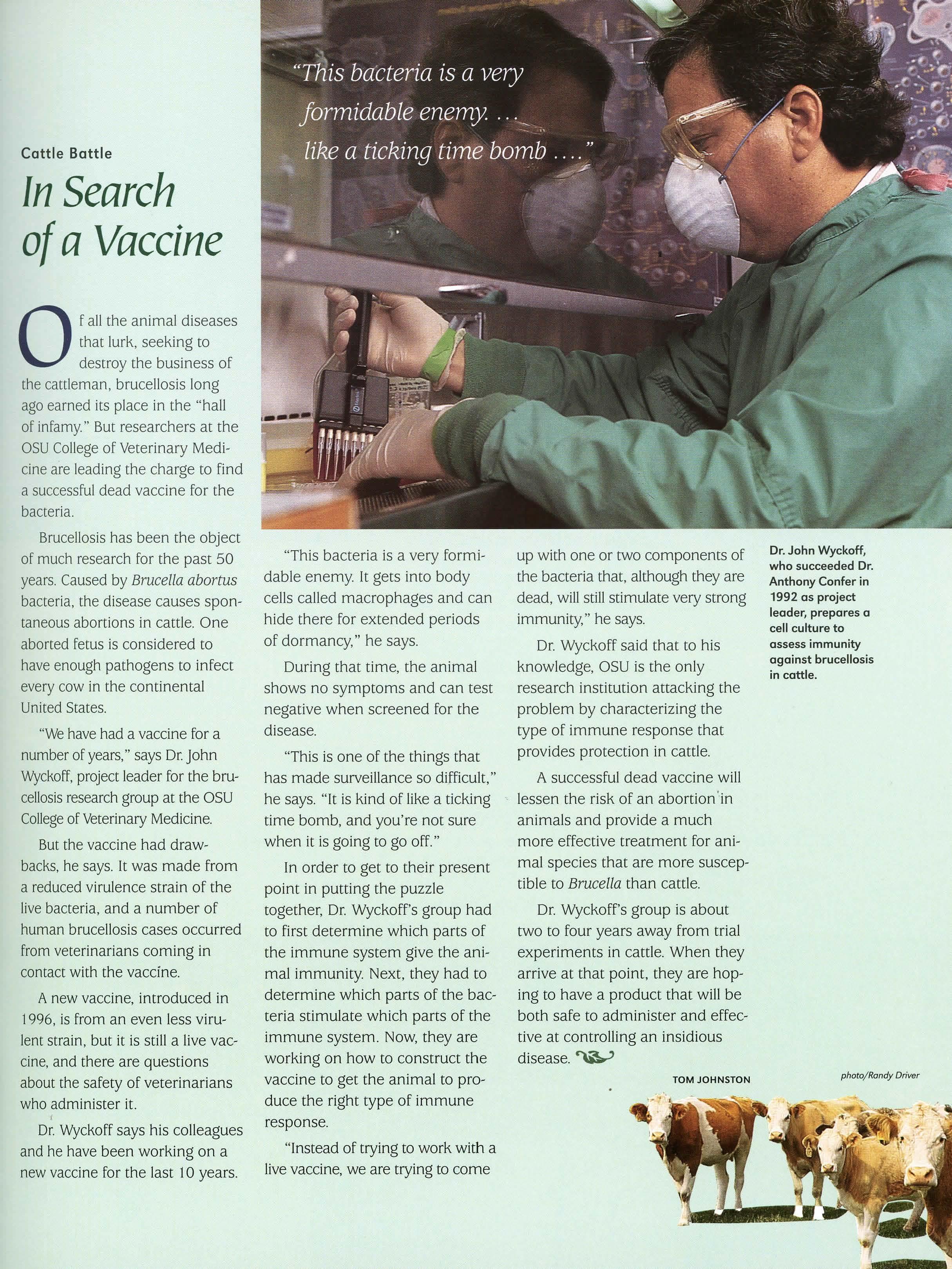 "We havehad a vaccine for a number of years," says Dr. John Wyckoff,project leader for the brucellosisresearchgroup at the OSU Collegeof Veterinary Medicine.