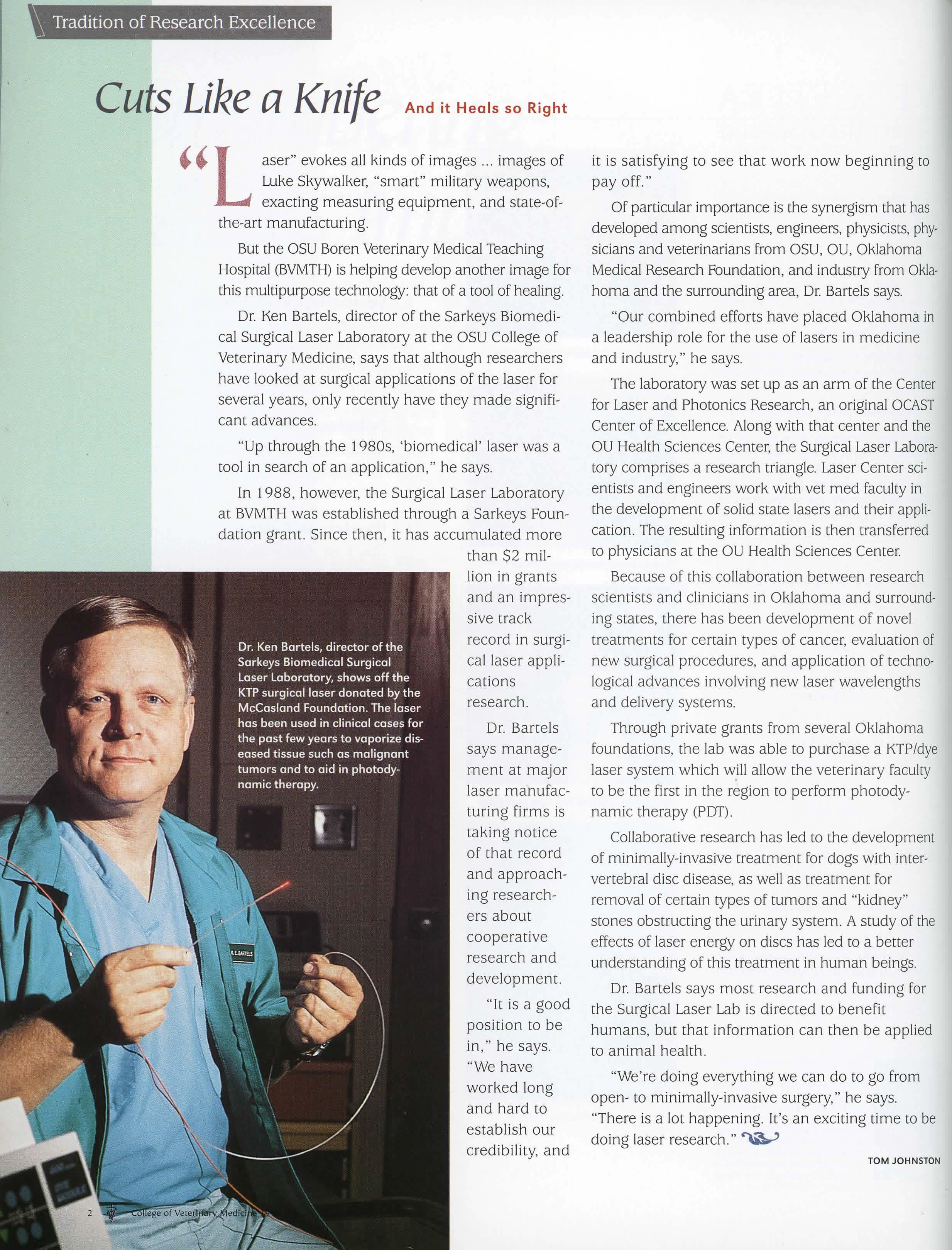 In 1988, however, the Surgical Laser Laboratory at BVMTH was established through a Sarkeys Foundation grant. Since then, it has accumulated more than $2 million in grants and an impressive track record in surgical laser applications research.
