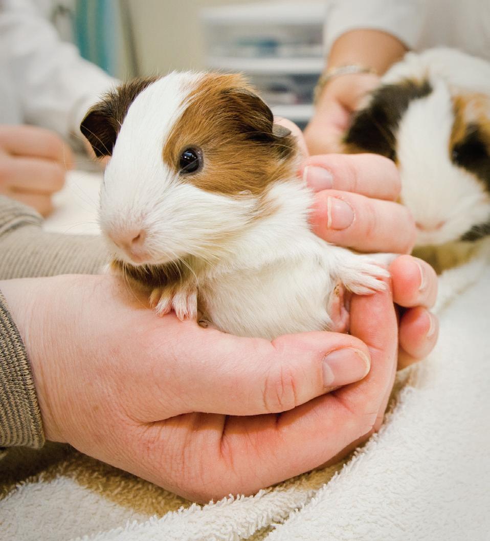 Meet Falafel , the daughter of Guiness and Tequila , shown in the background, and owned by Dr. Cornelia J. Ketz-Riley , head of OSU’s zoo, exotic, and wildlife medicine service (ZEW). Tequila became a resident of the teaching hospital’s ZEW service in 2009 to provide company to Guinness, a longtime ZEW resident. ZEW uses the Guinea pigs to teach veterinary students about proper husbandry and nutrition, as well as aspects of veterinary care, such as restraint, physical examination, birth control and treating reproductive or other problems that may occur. Guinea pigs have a long gestation time of 58-70 days. They give birth to fully developed young that are already furred, have their eyes and ears open and their second set of teeth. They are ready to follow their parents around and consume solid food from the first day of life, but they still enjoy their parents’ pampering and continue to nurse until about 6 weeks old. The ZEW service’s young Guinea pigs are usually up for adoption to good homes once they reach 8 weeks of age.