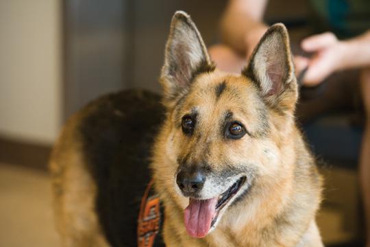 Daisy , a puppy in an animal shelter, was at OSU’s Veterinary Medical Hospital for her spay by supervised veterinary students honing their surgical skills. Dr. Lesa Staubus, a clinical assistant professor who works with the hospital’s Shelter Medicine Program, saw the puppy and called Sander, who was looking for a new dog.