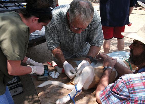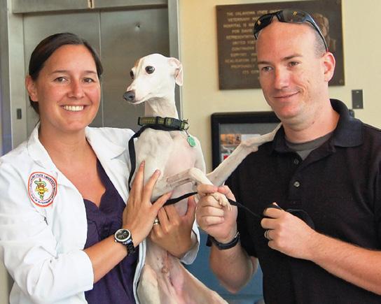 “Pup had bruising and bleeding into his side,” reports Dr. Kelci McKeirnan, lecturer and smallanimal surgeon. “The fluid built up and was separating his skin from his chest wall. We operated and drained 2 liters of fluid from the site and inserted a drain to allow the injured area to continue to heal. I don’t know if he was slammed up against something or if flying debris hit him, but he definitely had something happen to him during the tornado to cause the injury.”