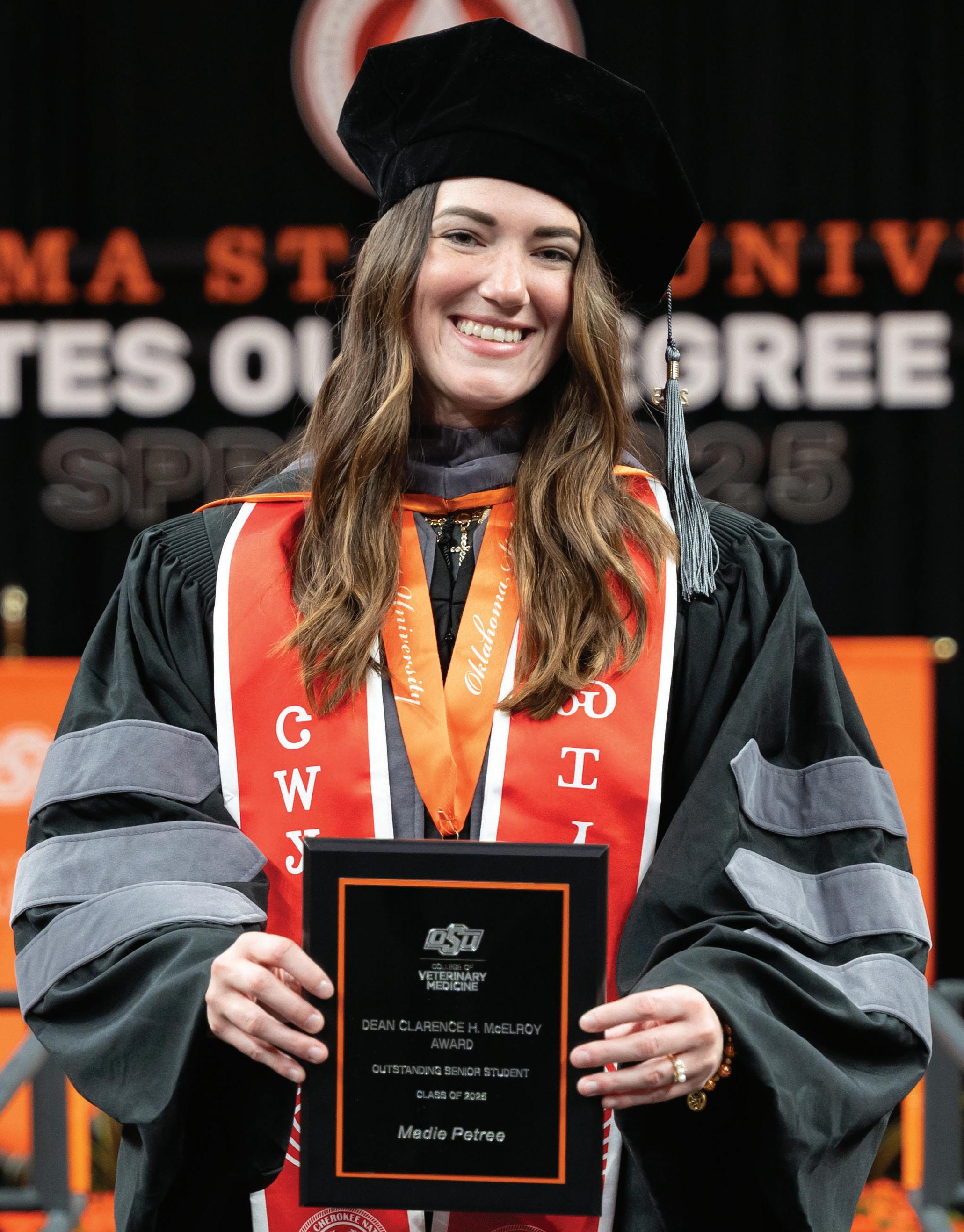Petree received her Doctor of Veterinary Medicine degree at Gallagher-Iba Arena in May. The same day, she was awarded the 2025 Dean Clarence H. McElroy Award — the highest honor presented to a graduating veterinary student.