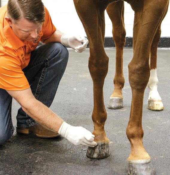 Dr. Mike Schoonover, equine surgeon and sports medicine and rehabilitation specialist, performs a coffin joint injection on a horse with osteoarthritis.