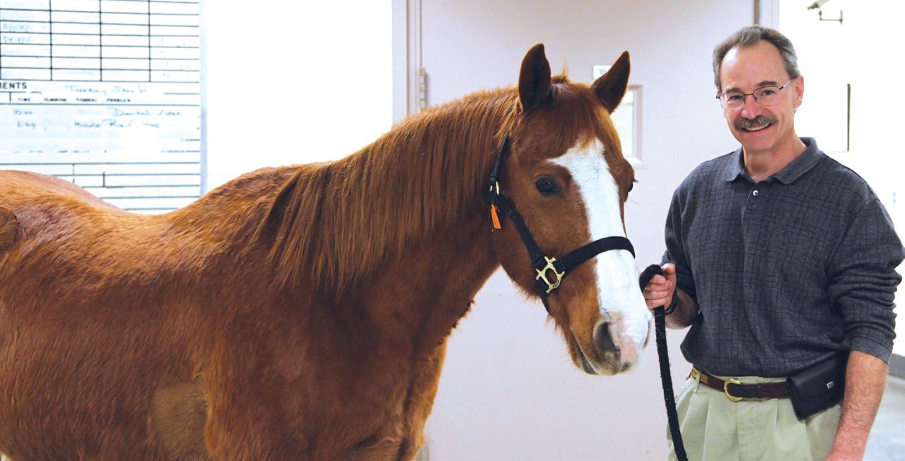 Endowed Chair in Equine Medicine and equine section chief, poses with a resident horse in the Gaylord Equine Performance Suite.