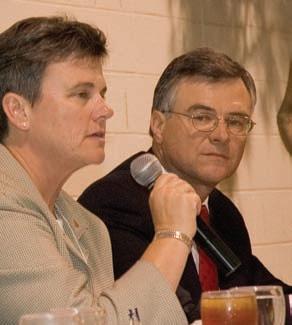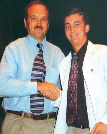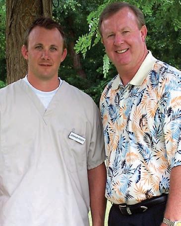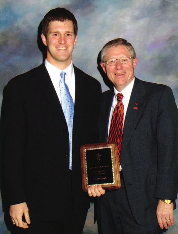 This year’s recipient of the McElroy Award, CVHS’ highest student honor, is Heath Qualls, left, class of 2005, who plans to specialize in equine medicine. Dean Michael Lorenz, DVM, at right, is also a McElroy Award recipient and the first OSU graduate to become dean of the Center for Veterinary Health Sciences.