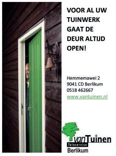 24/7 bereikbaar op 058-212 39 39 Gewoon goed en dichtbij ook als u elders verzekerd bent! Sem Dresdenstraat 6 . 8915 BZ Leeuwarden info@jelsumerhof.nl een persoonlijke uitvaart voor elk budget Bel 058 - 244 71 04 of ga naar monuta.nl/marthadevries U bent altijd welkom voor een open gesprek. Martha de Vries Groningerstraatweg 183 Leeuwarden 058 - 215 18 66 www.kreeftbedden.nl Slaapadvies van A tot Zzzz... sinds 1976 Pullman Express Vlak vanaf € 2699.Electrisch vanaf € 4049.Ledikant Mine Massief eiken inclusief nachttafels vana € 1525.Boxspring 800 Vlak vanaf € 1999.- Electrisch vanaf € 2799.Pullman Detroit Vlak vanaf € 4097.Electrisch vanaf € 5697.Matrassen 25% korting Boxspring Cinderella 1 persoons vanaf € 1349,2 persoons vanaf € 1949,Boxspring Eastborn Vlak vanaf € 2585.Electrisch vanaf € 3985.Boxspring Venice 1 persoons € 725.2 persoons vanaf € 1225.Boxspring Loft Vlak vanaf € 1399.Electrisch vanaf € 2099.SCHERP ZIEN ZONDER BRIL OF LENZEN NLZ2210_Nachtlenzen_advertentie_B2C_210x297mm_FC.indd 2 06-05-2022 09:25 April de maand van de nachtlenzen bij Pearle Opticiens Stiens Nu na aanmeten van de nachtlenzen, een Rayban zonnebril t.w.v. 99 euro gratis* Overdag scherp zien zonder bril of contactlenzen? Voel de vrijheid van nachtlenzen, 's nachts je ogen opladen voor overdag een scherpe blik, sport, comfort en verschillende zonnebrillen... GRATIS * vraag naar de voorwaarden Langebuorren 47, 9051 BE Stiens 058-2572112 VOOR COMPLETE REALISATIE VAN UW TUIN OF TERRAS Leveren en aanbrengen van: • Sierbestrating en tegels • Walbeschoeiing (hout of kunststof) • Erfverharding/tegels/houtsnippers/zand, grond en siergrind DE WISSEL | ST -ANNAPAROCHIE | INFO GEBRDRIJFHOUT NL WWW GEBRDRIJFHOUT NL