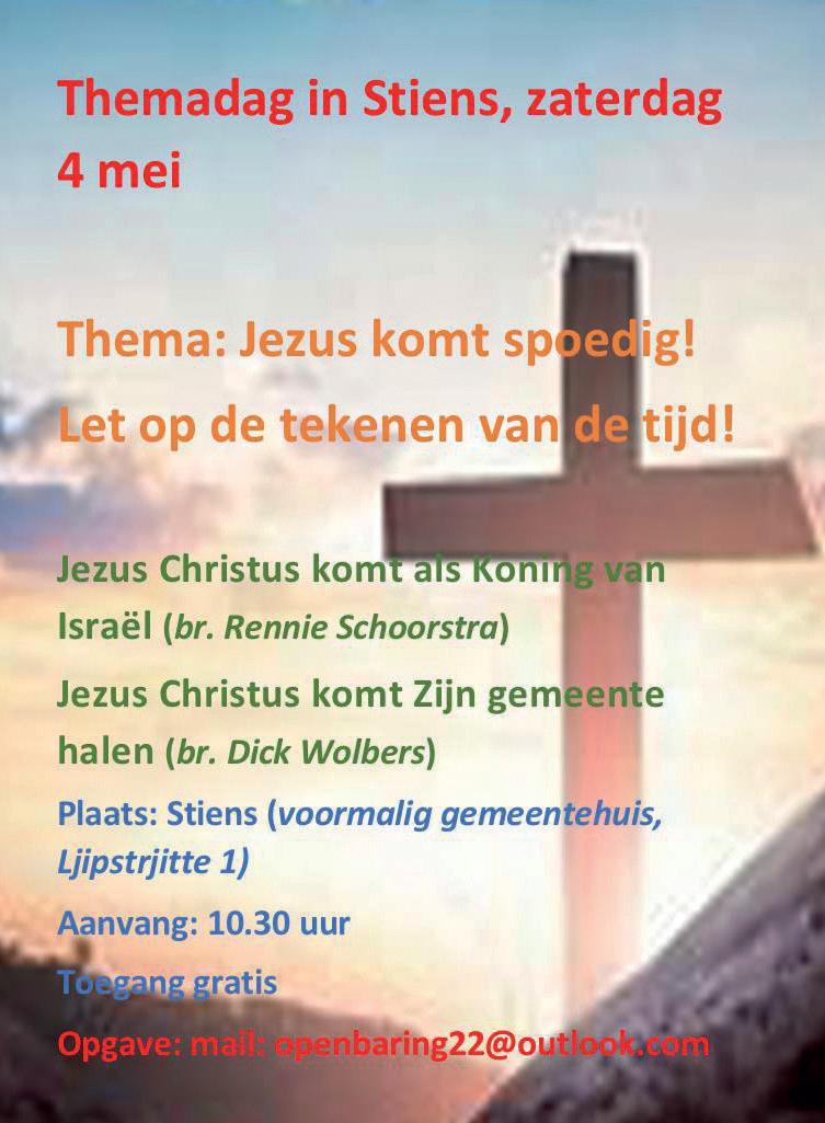 bij is. Wat God eeuwen geleden heeft beloofd gaat binnenkort gebeuren. U bent welkom op 4 mei om 10.30 in het voormalige gemeentehuis te Stiens, Ljipstrjitte 1. Inlichtingen 06 36264366 l