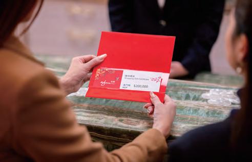 永利誠意推出四款精美賀歲糕點禮盒,為新春佳節走親訪友, 互贈佳禮的理想之選。年糕禮盒採用優雅別緻的聚寶盒設計, 以喜慶的中國紅為主色調,以燙金工藝訂製金蛇、中國結及花 蕊元素,寓意金蛇獻「蕊」、步步「糕」陞,將吉祥好運悉數收 入盒中。另外,禮盒搭配以傳統工藝打造的刺繡金蛇袋,用香 檳金絲線在細膩蛇紋布上呈現兩條栩栩如生、活靈活現的金 蛇刺繡圖案,花卉圖案象徵花香富貴,傳達送禮的吉 祥美好
