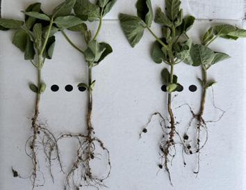 ■ Soybean typically acquires about 50% of its nitrogen (N) needs through nodules established by Bradyrhizobium bacteria. However, during early season growth, before these nodules are fully established, the soybean plant depends entirely on soil N uptake for its initial development.