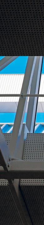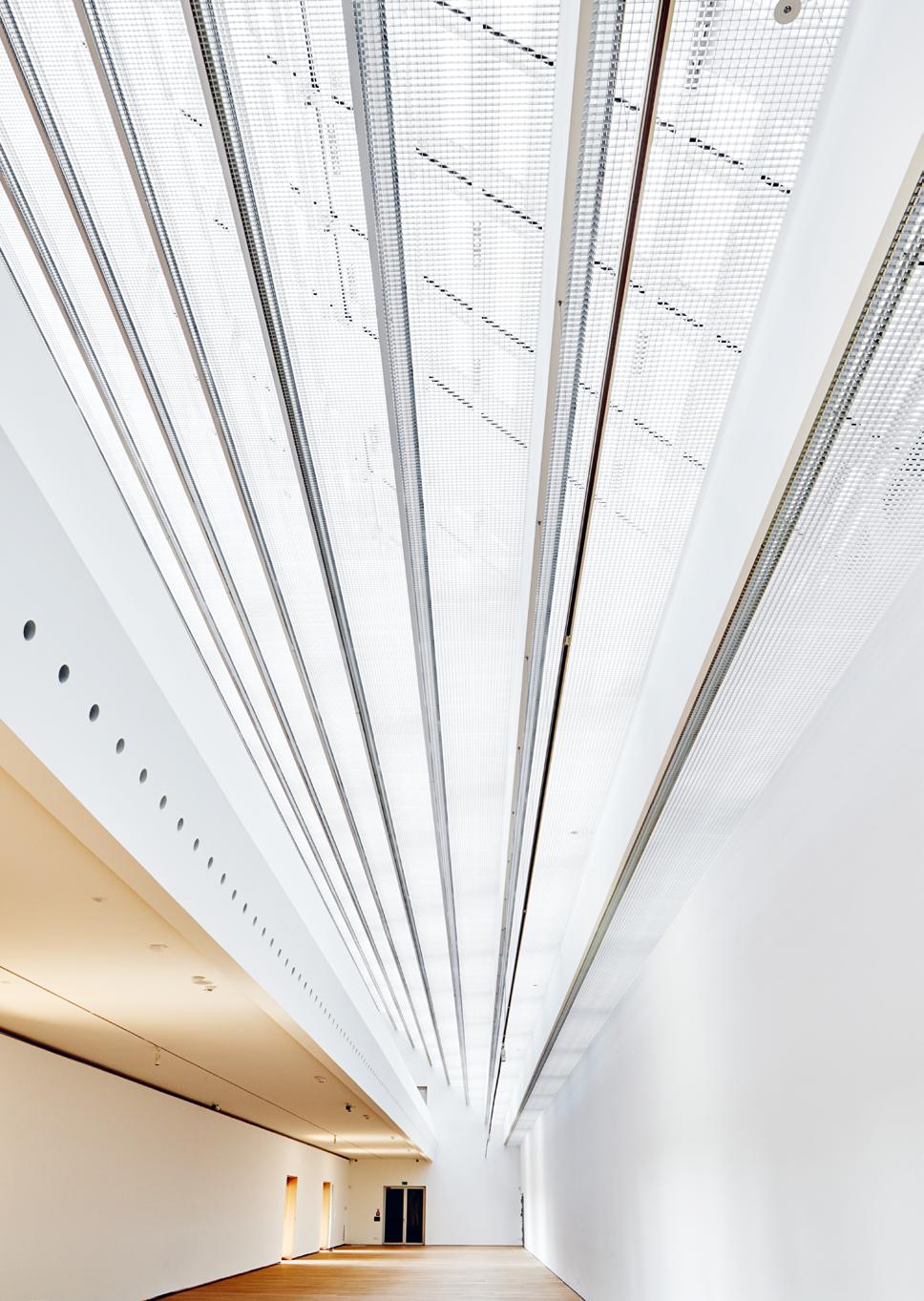 motív z fasády Administratívnej budovy (ale aj jeho stavby Viacúčelového zariadenia v Modre Harmónii) v interiéri. Použitý akustický sadrokartón, okrem dob rých vlastností, opäť vytvára už spomínanú svetelnú „sedžima“ atmosféru. Presklený strop je nakoniec bez podhľadu a z jedného uhla je vidieť oblohu — všetky technické časti sú nastriekané na bielo a priznané. Podlaha je z brúseného betónu a pôsobí, ako by tam bola už od 30. rokov. Atraktívne sú aj priehľady do výstavných siení. Okrem Depozitárneho domu nie je nič v novom areáli celkom uzatvorené.
