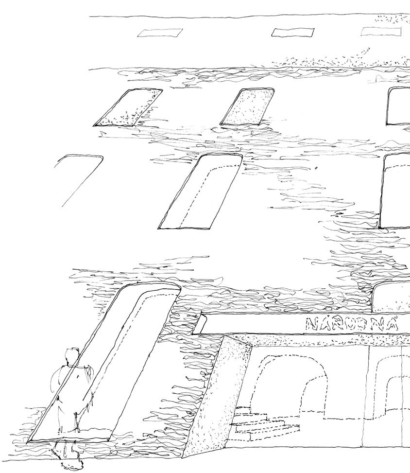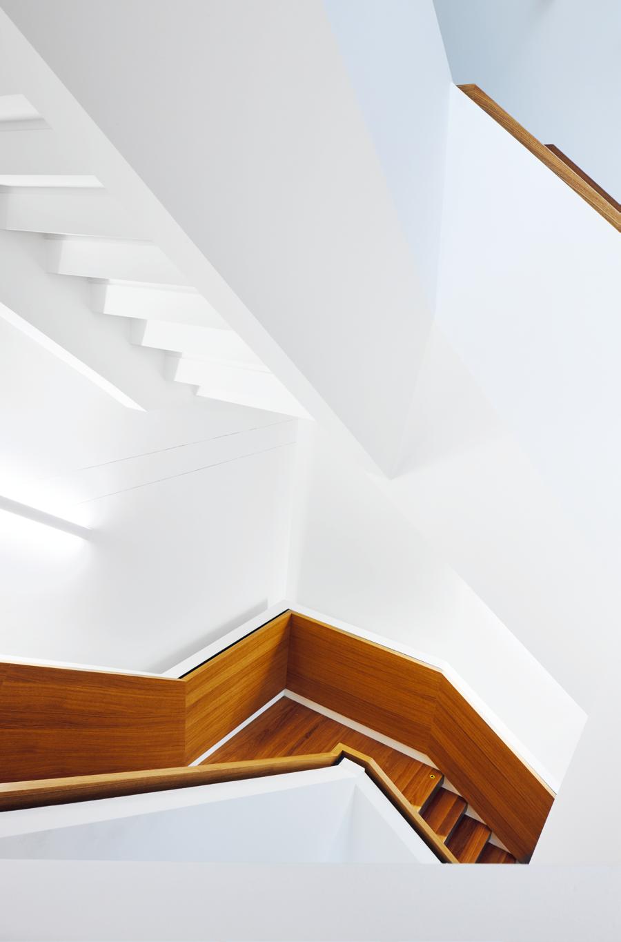 Umiestniť schodisko pod Premostením umožnilo roz hodnutie vytvoriť Depozitárny dom a bývalý depozitár čiastočne otvoriť. Pôvodne tam mali byť expozičné priestory, ale na základe rozhodnutia investora nastala zmena projektu a bola sem umiestnená Umenovedná knižnica. Nové schodisko opäť veľmi jasne manifestuje stret ortogonalít Vodných kasární s Premostením — nie sú v pravom uhle. Vďaka stupňom schodiska, a teda pozvoľnému znižovaniu nivelety sa posunula rímsa „anglického dvorčeka“ ďalej do nádvoria, a tak pomohli vnímaniu prízemia zo suterénu — keď stojíte dole v knižnici, nemáte pocit, že sa nachá dzate v suteréne. V neposlednom rade tak vznikol priestor na kultúrne a „rekreačné“ využitie verej ného priestoru — schody sa môžu stať hľadiskom, alebo sa návštevník môže na nich iba „povaľovať“ a pozorovať dianie na nábreží či v študovni.