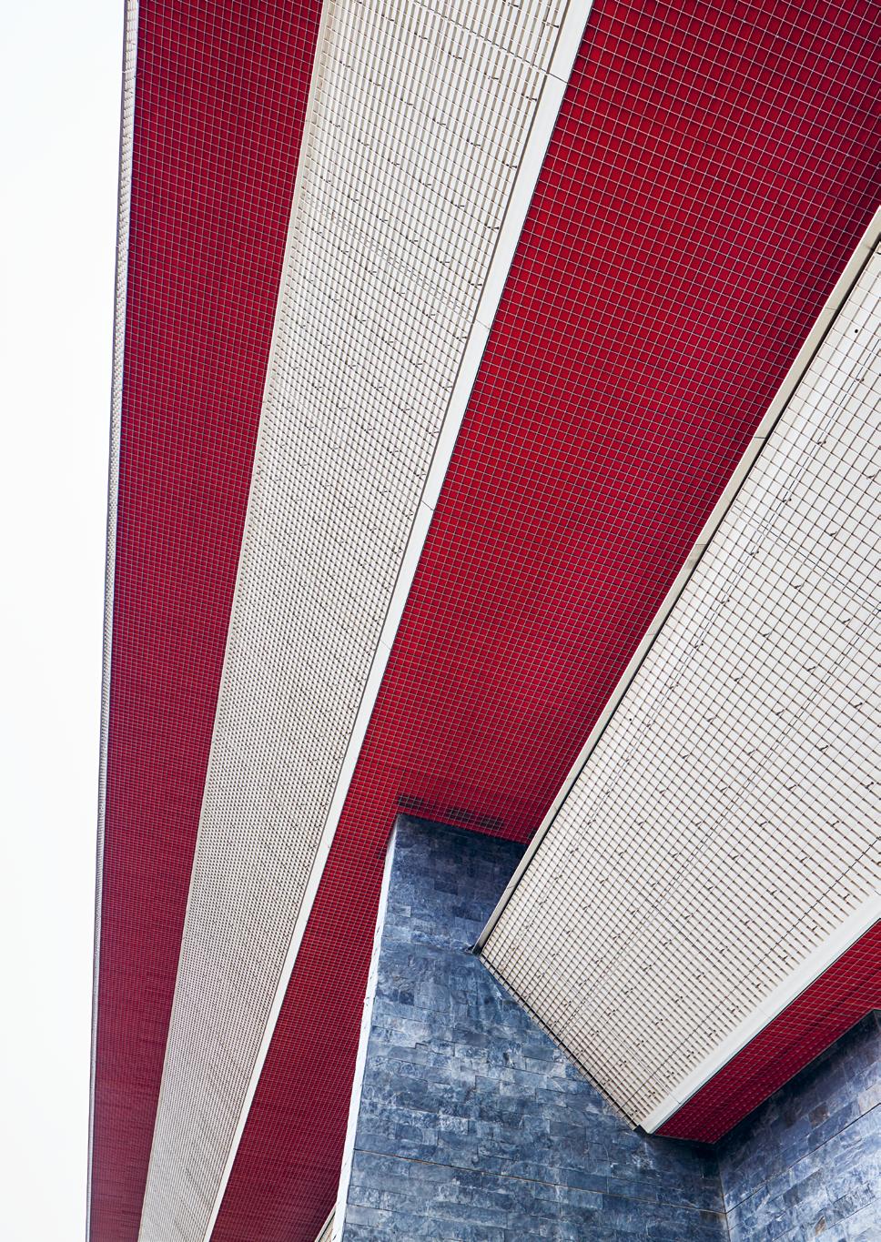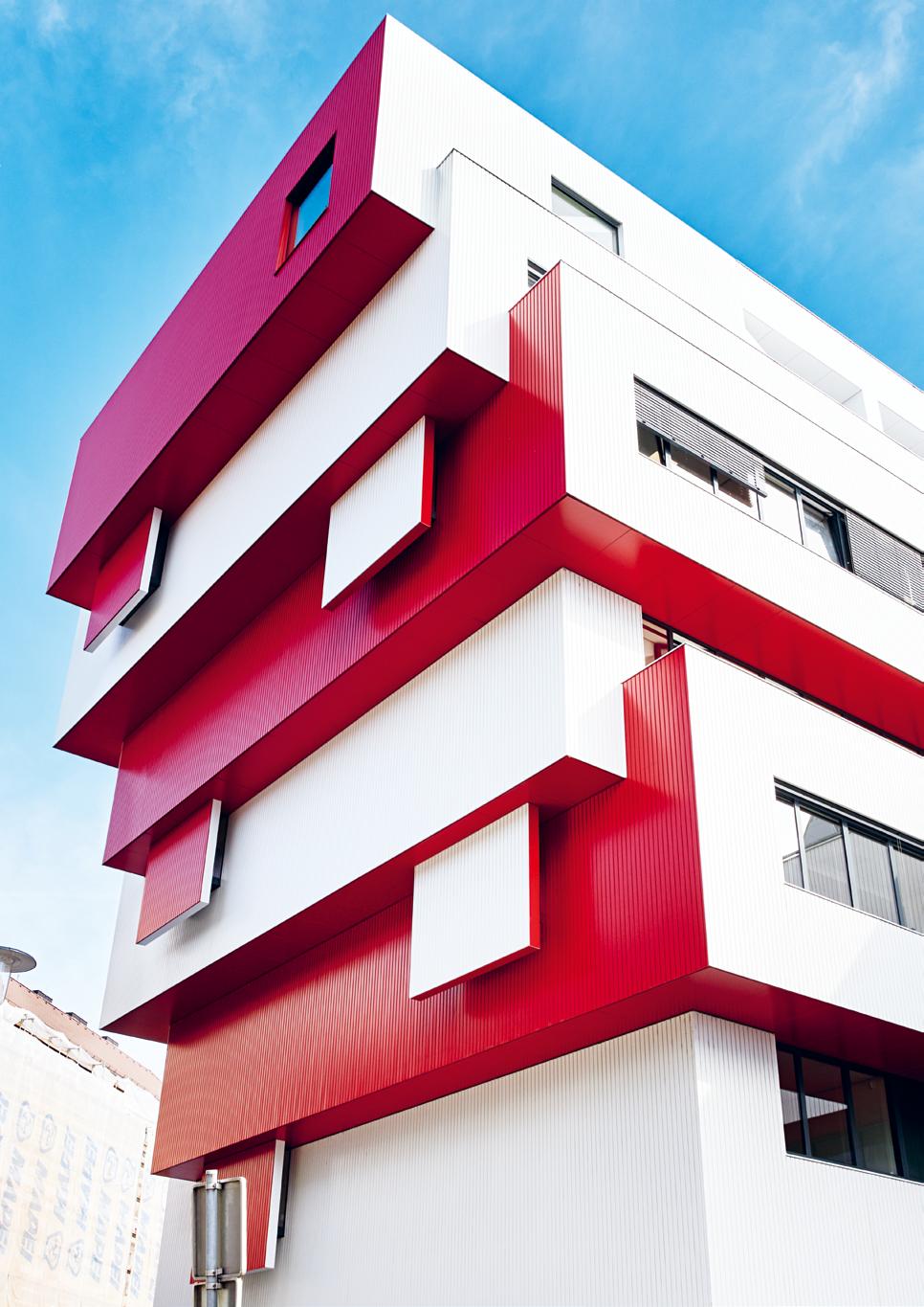Keďže princípom je červená farebnosť horizontál, je spodný plášť červený tiež s predstaveným roštom. Je plytší a má inú funkciu než rošt na fasáde — je tam z dôvodu akustiky, má tlmiť odraz zvuku od vozovky (frekventovanej cesty s elek tričkami). Ten sa o rošt rozbije, potom ho pohltí perforovaná fasáda a časť sa rozplynie v mäkkom materiáli za ňou, len zvyšok sa odrazí do nádvoria.
