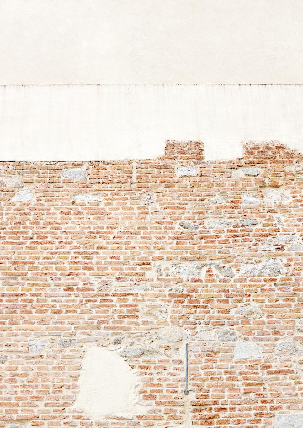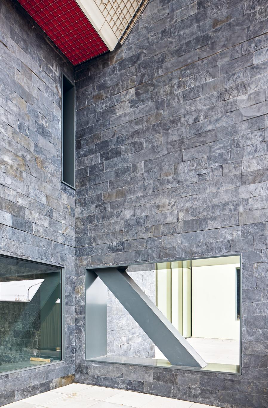 Rekonštrukcia funguje na princípe spriechodnenia celého areálu galérie, to znamená, že sa pôvodne zadné a zastrčené fasády Vodných kasární ocitajú vo funkčných vzťahoch a na exponovaných mies tach — asi najvýraznejšia je ich západná fasáda, ktorá sa stala súčasťou interiéru, východnou stenou zastre šeného Átria. Finálna fasáda sa vyberala z niekoľkých variantov. Nakoniec sa po búrlivej diskusii s odbor níkmi z Pamiatkového úradu SR podarilo presadiť „očistenú“ — analytickú fasádu. Zvolili sme ju aj preto, aby sa budova Vodných kasární fasádou jednoznačne v štruktúre areálu v kontraste s novšími stavebnými vrstvami jasne presadila ako historický prvok. Architekti zvažovali pretrieť tehlovú fasádu zjednocu júcou lazúrou, no aj na žiadosť investora zvíťazila čistá obnažená fasáda, ktorá prezentuje všetky stavebné vrstvy a situácie — barokové zmiešané murivo (tehla a kameň), zabudované kovové tiahla, železné nosníky zo 70. rokov 20. storočia, ale aj stavebné otvory, kto rými bola vedená vzduchotechnika. Vypadnuté časti fasády boli lokálne omietnuté, rovnako i zaslepenia obnovených okien. Farba omietky sa dlho vyberala, aby nevznikol veľký kontrast medzi tehlou a omietkou.