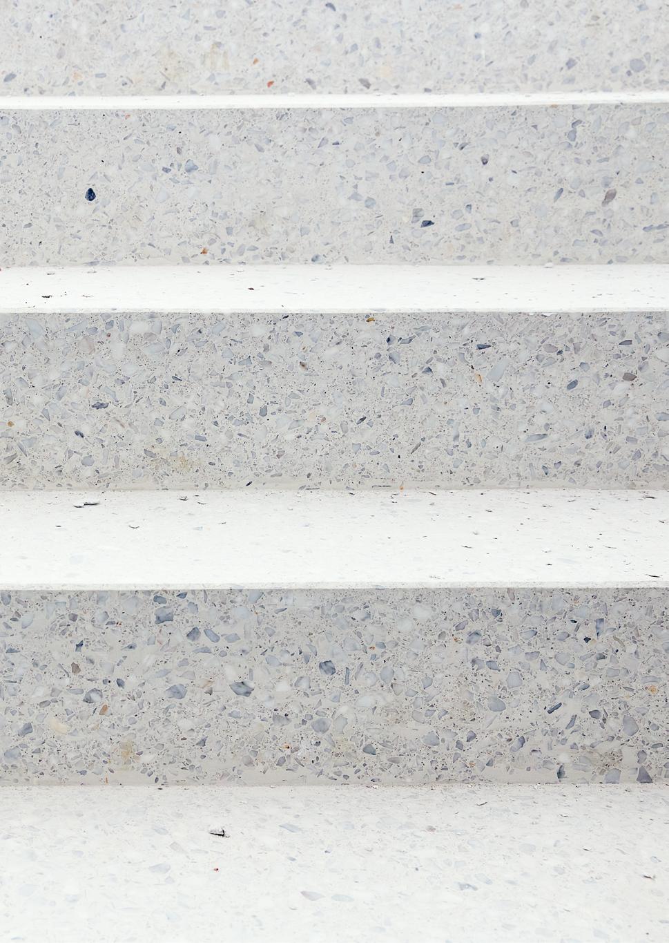 na chodbách a vo všetkých prízemných verejných prevádzkach. Navrhnuté je s detailom prebratým zo schodiska v Administratívnej budove, ľudovo nazývaným „Dedečkove lyže“. To je medzera medzi stupňami a zábradlím, ktorá vykresľuje jednotlivé stupne a schodisko podčiarkuje ako výrazný priestorový prvok. Tento detail sa opakuje na viacerých miestach (schodiská do knižnice, schodisko v Átriu). Farba aj obsah terazza (liate terazzo je leštená zmes kamienkov s pojivom) pracujú s ideou recyklácie, ktorá je ďalším dôležitým princípom rekonštruk cie — okrem mramoru sú do zmesky primiešané pomleté travertínové obklady z prízemia arkád. Madlo schodiska je z matného skla, vďaka čomu je napriek subtílnemu materiálu opticky hmotovejšie, čo odkazuje na barokové hmoty pôvodnej stavby. Takto sa toto zábradlie javí ako súčasné, ale zároveň akoby sa jedným okom pozeralo do minulosti.