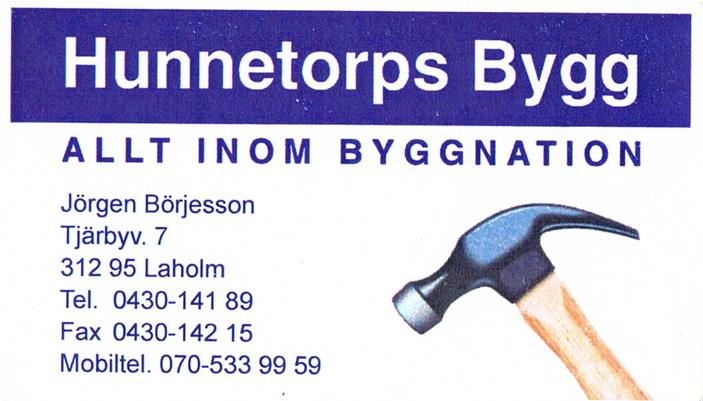 Hunnetorps Bygg är ett utav Hallands stoltheter, baserad i Laholm. Hunnetorps Bygg hjälper gärna till med mindre plåtslageriarbeten, murning och trädgårdsanläggning. Om ni behöver hjälp med ombyggnad, tillbyggnad eller renovering så kontakta Jörgen. Webbsida på https://www.hunnetorpsbygg.se/info.html eller numret 0705 33 99 59