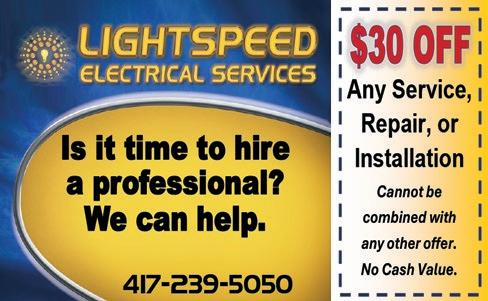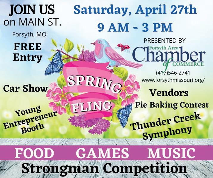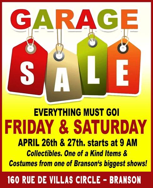 1 p.m., with vendor setup beginning at 6 a.m. The sale will feature up to 70 booths, providing a great opportunity to find that “once-in-alifetime” bargain. Booth spaces are available for a $25 fee and are approximately 18 ft. x 18 ft. Registration is available online or in-person at the Branson RecPlex, located at 1501 Branson Hills Pkwy, Branson. Vendors are responsible for all tents, tables, chairs, etc. For more information or questions, please contact the Branson RecPlex at 417-335-2368 or visit our website at https:// bransonmo.gov/710/Community-Garage-Sale.