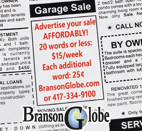 Classified ads in the Branson Globe Black & white line ads 20 words or less: $15/week Each word over 20 is 25¢ Add color to your line ad, 20 words or less: $20/week Each word over 20 is 25¢ Call 417-334-9100 today or bransonglobe.com/advertise 417-334-9100 OFFICE HOURS: 9am - 5pm Monday to Friday TO ENSURE THE BEST RESPONSE TO YOUR AD... Please make sure your ad is correct in the first issue in which it appears. The Branson Globe is responsible for one day’s charge of the space occupied by the error. If your ad is not correct, call us immediately to have it corrected. We can help you with your rent, groceries