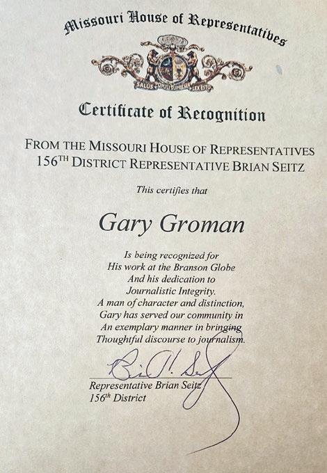 At the June 25, 2024, Branson City Hall meeting, Brian Seitz surprised Gary Groman with this recognition award. Branson Globe owner and publisher, Rob Doherty, commented: “Gary and his dedication to the Branson Globe are unwavering and it’s a pleasure working alongside him for almost four years now.” All of us at the Branson Globe, along with our loyal readers, echo Doherty’s words, and congratulate Groman on the well-deserved honor!