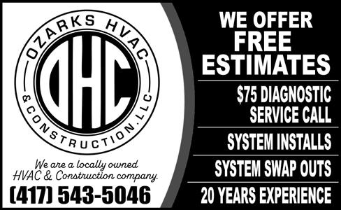 ACE HOME IMPROVEMENT: Heating and air, HVAC service and repair, doors, windows, decks, fences, pressure washing, interior and exterior painting, siding, roofing, flooring, tile and drywall. Handyman work! Call Ryan: 417-335-1347.