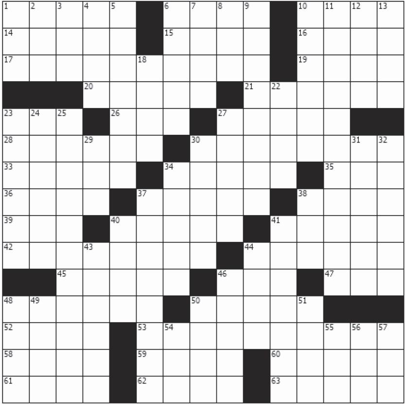 41. Half of a notorious film duo 42. Swiftly 44. Onion sections 45. Ghost town’s mayor or police chief? 46. Certain access code 47. Gathered dust 48. Legendary 50. Fountain treats 52. Wait in the shadows 53. Geneva poker pot? 58. Southwestern natives 59. Muck 60. Aerosmith lead singer 61. Kind of builder 62. Kernel 63. Downsizer’s task Down 1. Hang loosely 2. Self starter? 3. Wine consideration 4. Ukraine’s capital 5. They may break the ice?