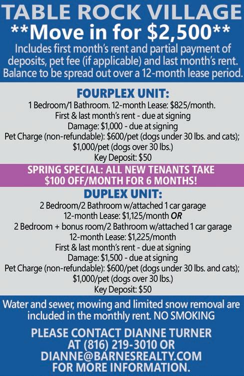 RENTAL: Family friendly. Deposit and rule agreement required. Cable/WiFi included. No dogs. $191/week. Colonial Mountain Inn, Branson West 417-272-8414.
