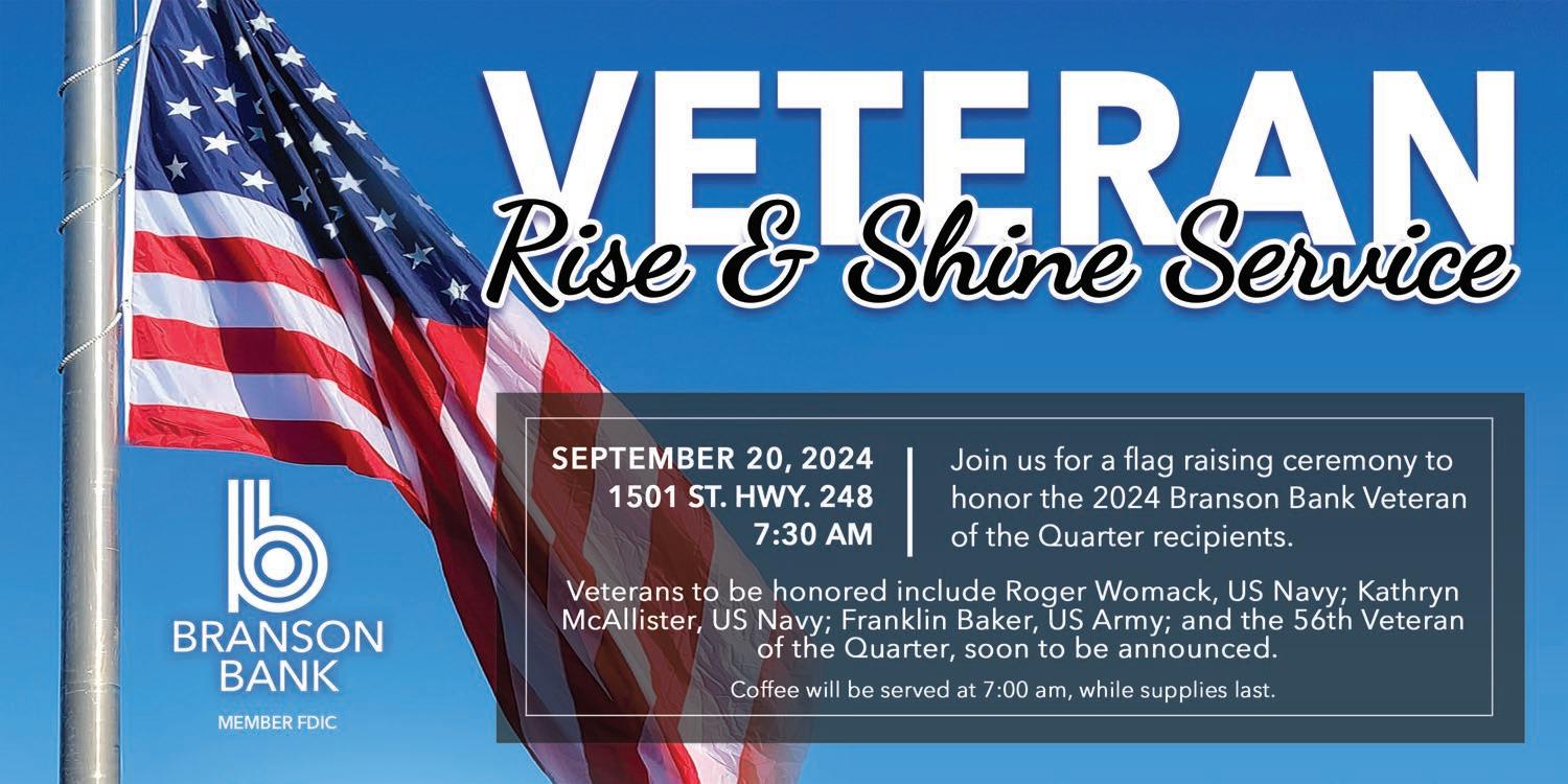 U.S. Navy; Franklin Baker, U.S. Army; and the 56th Branson Bank Veteran of the Quarter, soon to be announced. The bank’s large, garrison-sized flag will be raised in their honor while Bob Smither plays “Reveille” on the trumpet.