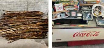 MISCELLANEOUS: 1950’s/60’s Beverage Air Coke machine cooler chest type refrigerated, Vintage Coke carrier, Vintage Coke fishing pole, Vintage Coke clock, Canning jars, Crocks, Metal glider, Walking sticks made from native wood made by Bob. Kerosene & electric heaters, Electronics, Yard art, Pictures, Locally made cedar hanging patio swing, Jewelry.