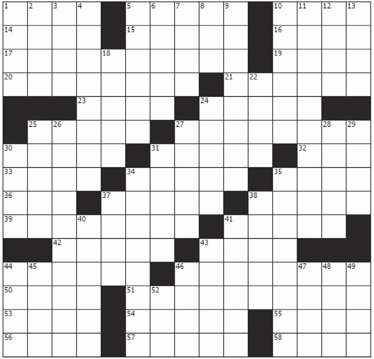 42. Appears 43. Columnist Barrett 44. Common airline carry-on 46. Certain relative 50. Perry’s creator 51. Way out West, once 53. Glum drop? 54. More than merely ready 55. Jasmine or morning glory, e.g. 56. Verbalizes 57. Isn’t supporting 58. Resurgently Down 1. Lessons for the young 2. Gallivant 3. To boot 4. One-upped 5. They may be marching 6. Boxing’s Archie 7. Layers of green eggs 8. Some consider it a gift 9. Deer playmate? 10. Without charge