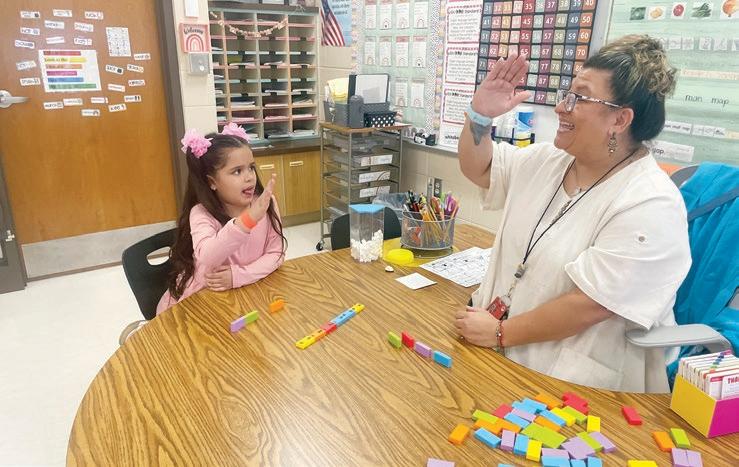 Valerie Plaza Diaz practices sounding out words she created using phonetic dominoes with her teacher Fabiola Lichty. (Photo submitted)