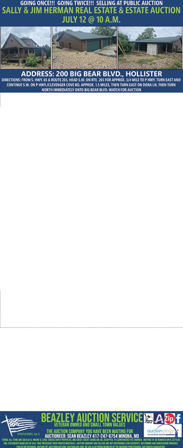 TO ENSURE THE BEST RESPONSE TO YOUR AD... Please make sure your ad is correct in the first issue in which it appears. The Branson Globe is responsible for one day’s charge of the space occupied by the error. If your ad is not correct, call us immediately to have it corrected.