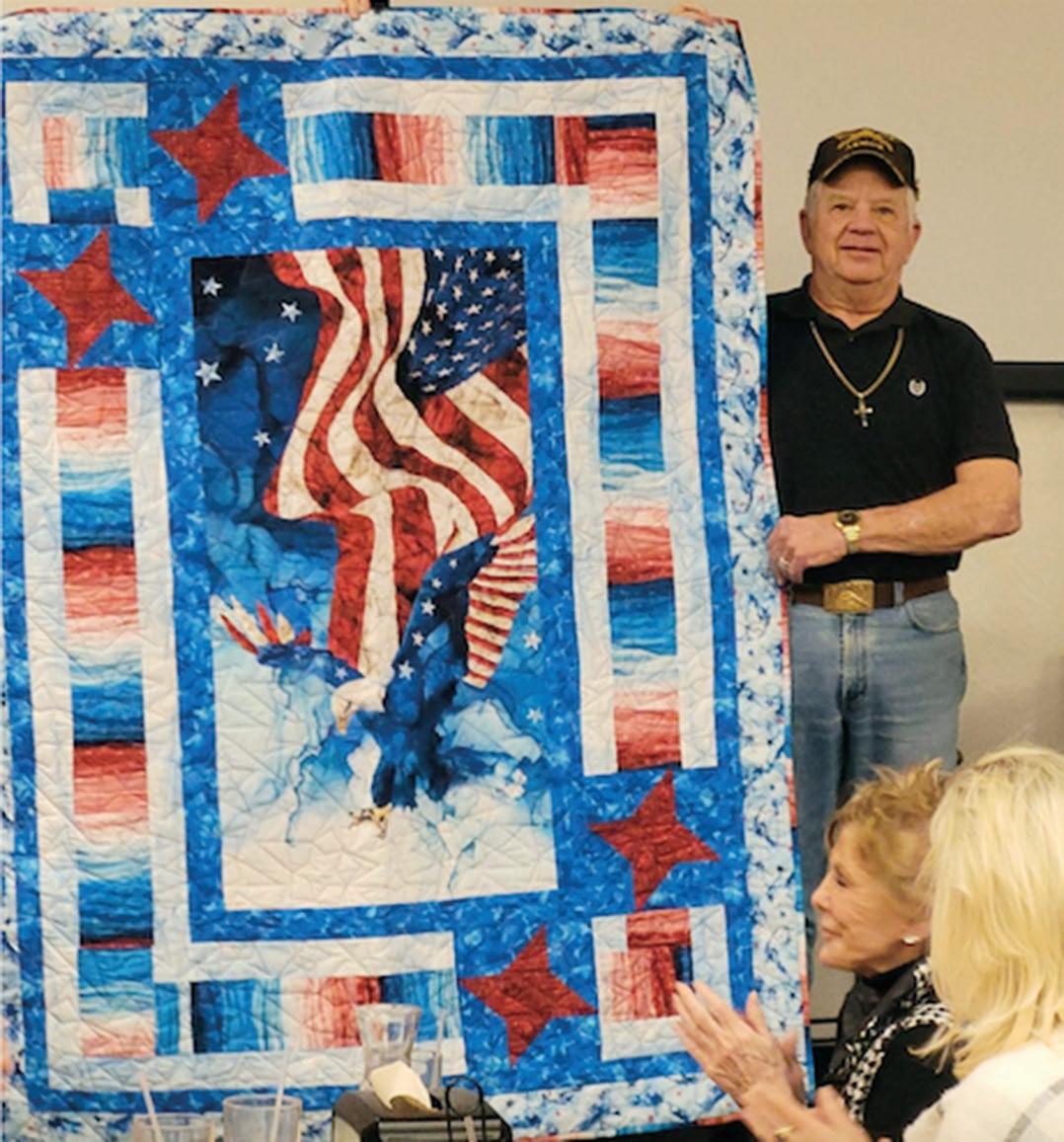 On February 24, members of Table Rock Quilts of Honor presented 11 quilts to members of BVA (Branson Veterans Association) at Golden Corral in Branson. On February 28, Table Rock Quilts of Honor volunteers Janie Mahon and Paula Powell surprised Branson Mayor Larry Milton at the Branson Chamber of Commerce with a quilt honoring his service. The Table Rock Quilts of Honor’s mission is to “bestow a universal symbol and token of thanks, solace and remembrance to those who serve in harm’s way to protect and defend our lives and freedoms.” Volunteers meet at Chances of Stone County in Reeds Spring on the first Monday of each month at 10 a.m. (Photos submitted)