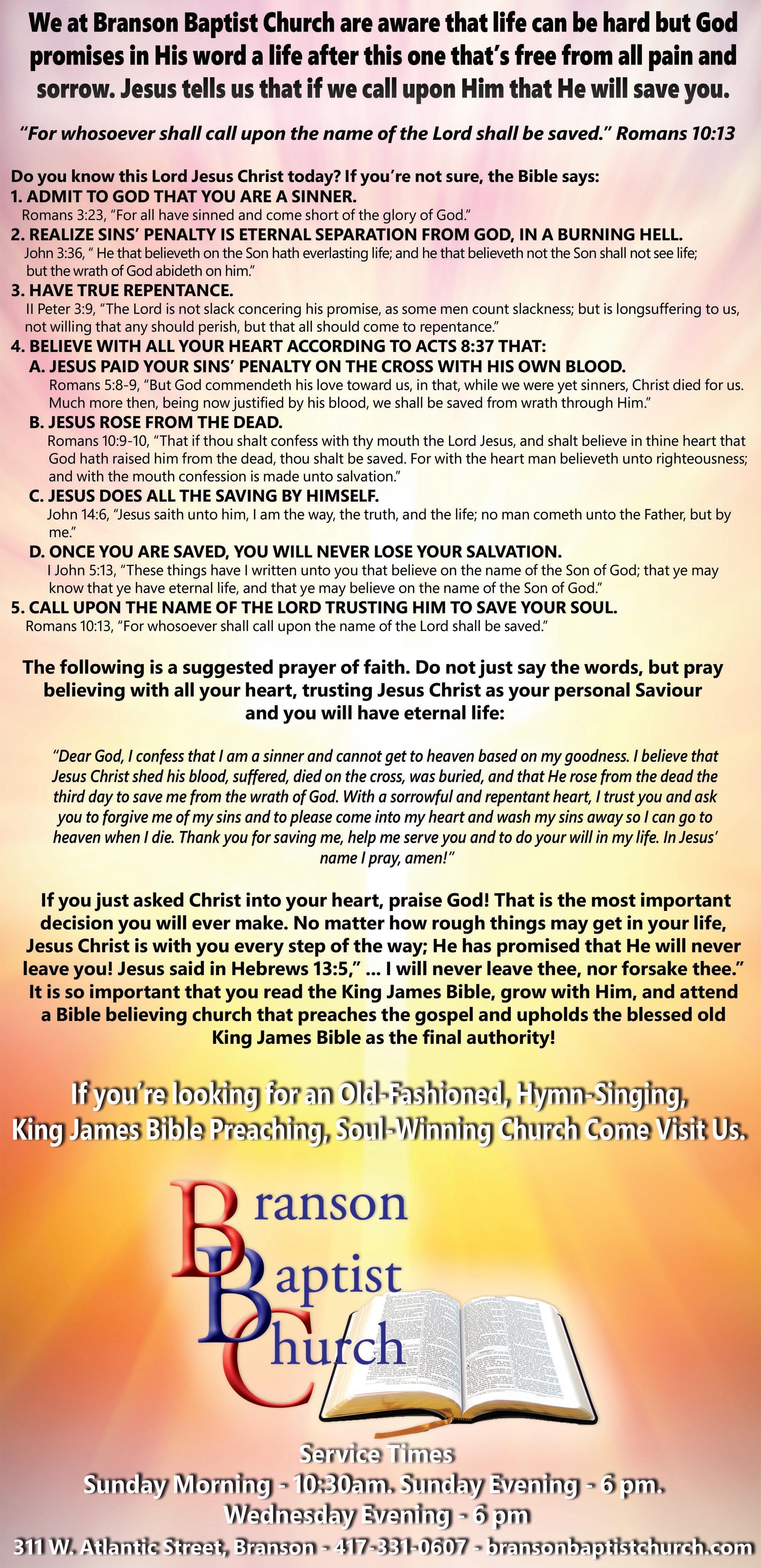 GRIEF SHARE: Branson United Methodist Church (1208 W. 76 Country Blvd.) will begin GRIEF SHARE CLASSES on Tues. March 4, at 1:30 p.m. in the church library. There will also be a 5 p.m. class for those who work. BOTH CLASSES will be on TUESDAYS. Grief is a journey we all travel, and coming together helps us realize others have the same questions and doubts! EVERYONE is welcome!! This is a 13-week support group and there is NO CHARGE. For questions, please call Peggy at 641-919-1533.