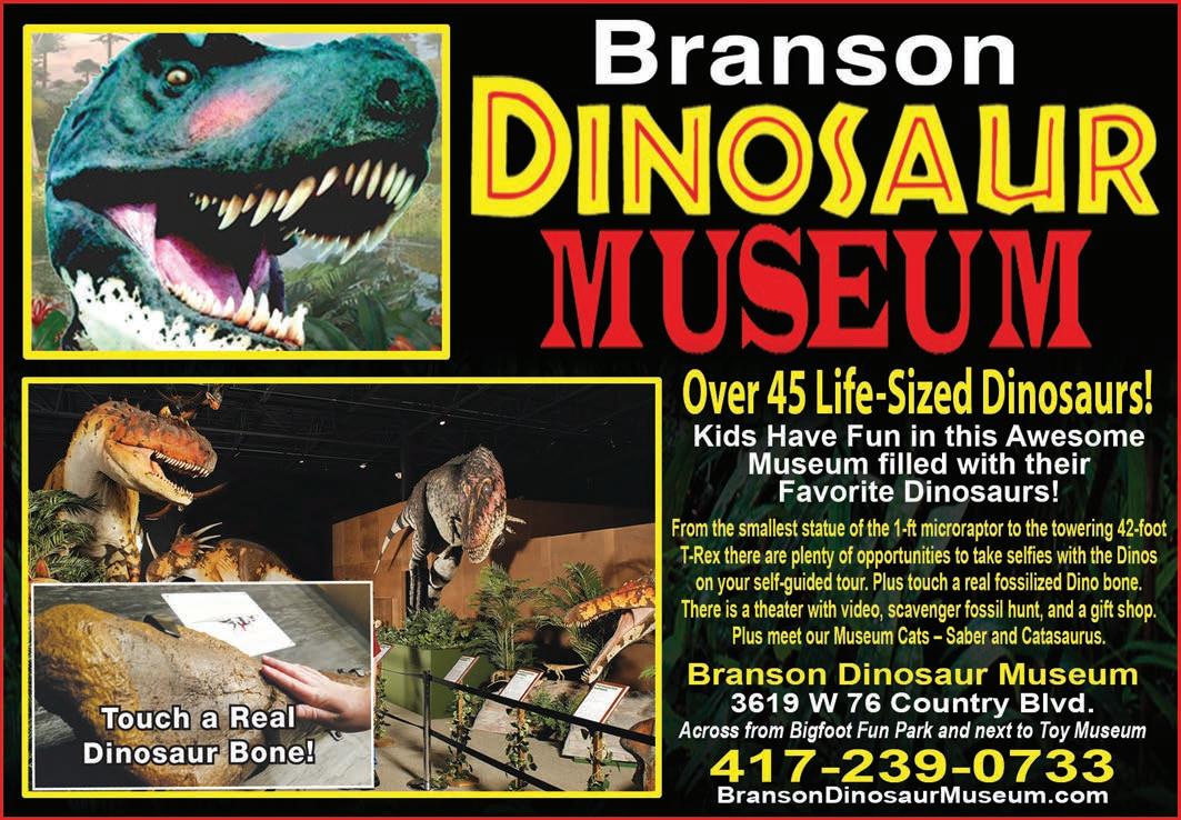 Over 45 Life-Sized Dinosaurs! Kids have fun in this awesome museum filled with their favorite dinosaurs. Plus touch a real fossilized Dino bone. BransonDinosaurMuseum.com