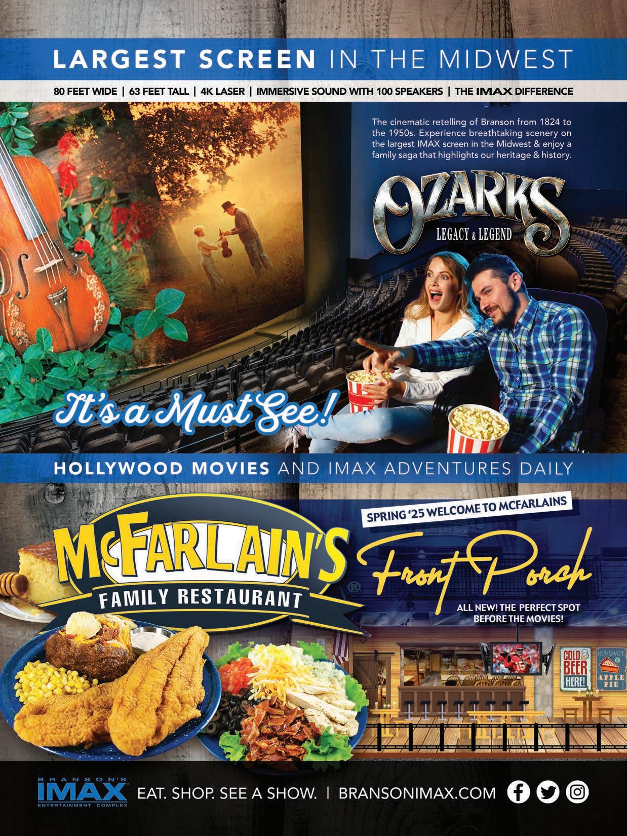 Delicious Ozark Cuisine in an atmosphere inspired by the IMAX adventure “Ozarks Legacy and Legend.” Enjoy signature menu items and homemade pie. BransonImax.com
