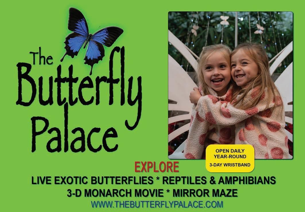 Step into another world at The Butterfly Palace & Rainforest Adventure! Enjoy hours of family fun in a state-ofthe-art, tropical rainforest facility featuring thousands of live, exotic butterflies, explore the Rainforest Science Center filled with live reptiles and amphibians, the Banyan Tree Adventure, and Mirror Maze.