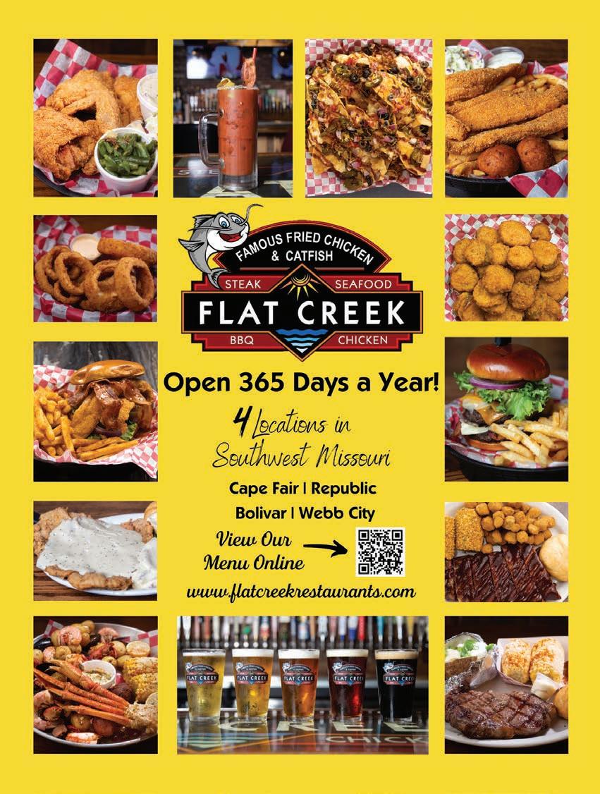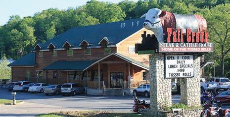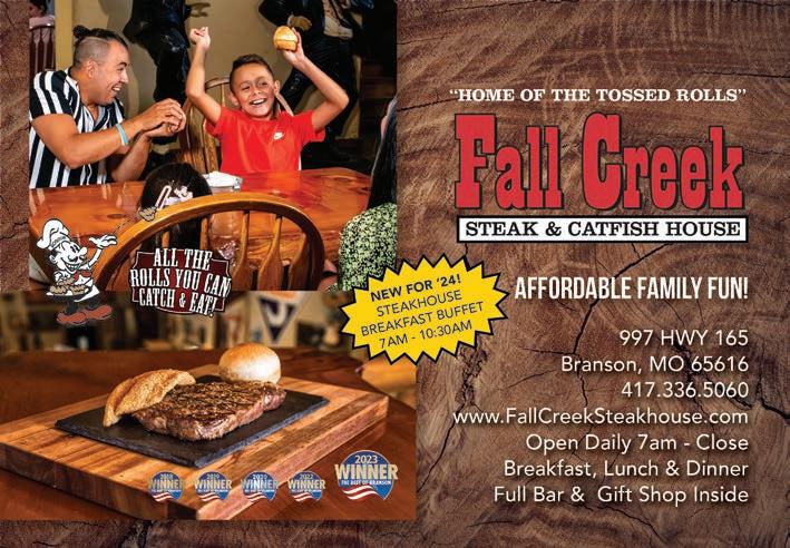 Fall Creek Steak & Catfish House has been a popular Branson dining destination for over 20 years. This family friendly restaurant is known for serving flavorful steaks, tasty handbreaded catfish fillets and freshfrom-the-oven, melt-in-your-mouth tossed dinner rolls. Fall Creek Steak & Catfish House alongside Fall Creek and features an open, airy interior decorated with an eclectic mix of patriotic and Americana décor.