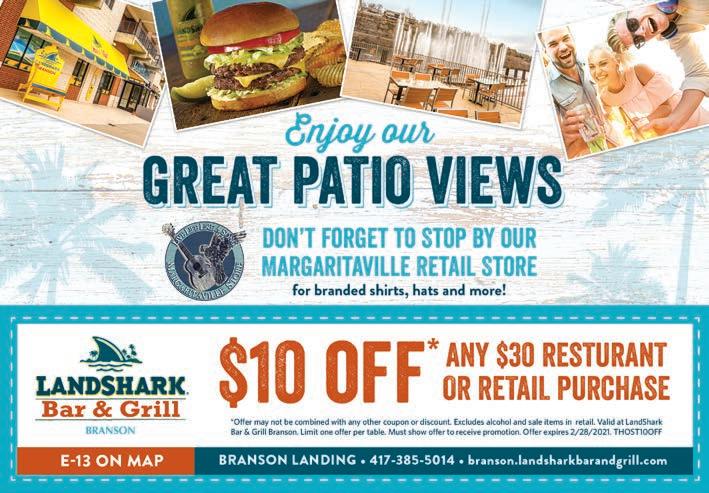 Located at the Branson Landing, Landshark Bar & Grill is a great place for lunch or dinner and is the perfect spot for an ice cold beer or cocktails while taking in the beautiful waterfront views of Lake Taneycomo. Grab a table on the outdoor patio and you’ll have a front row seat for the Landing’s hourly fire & water shows.