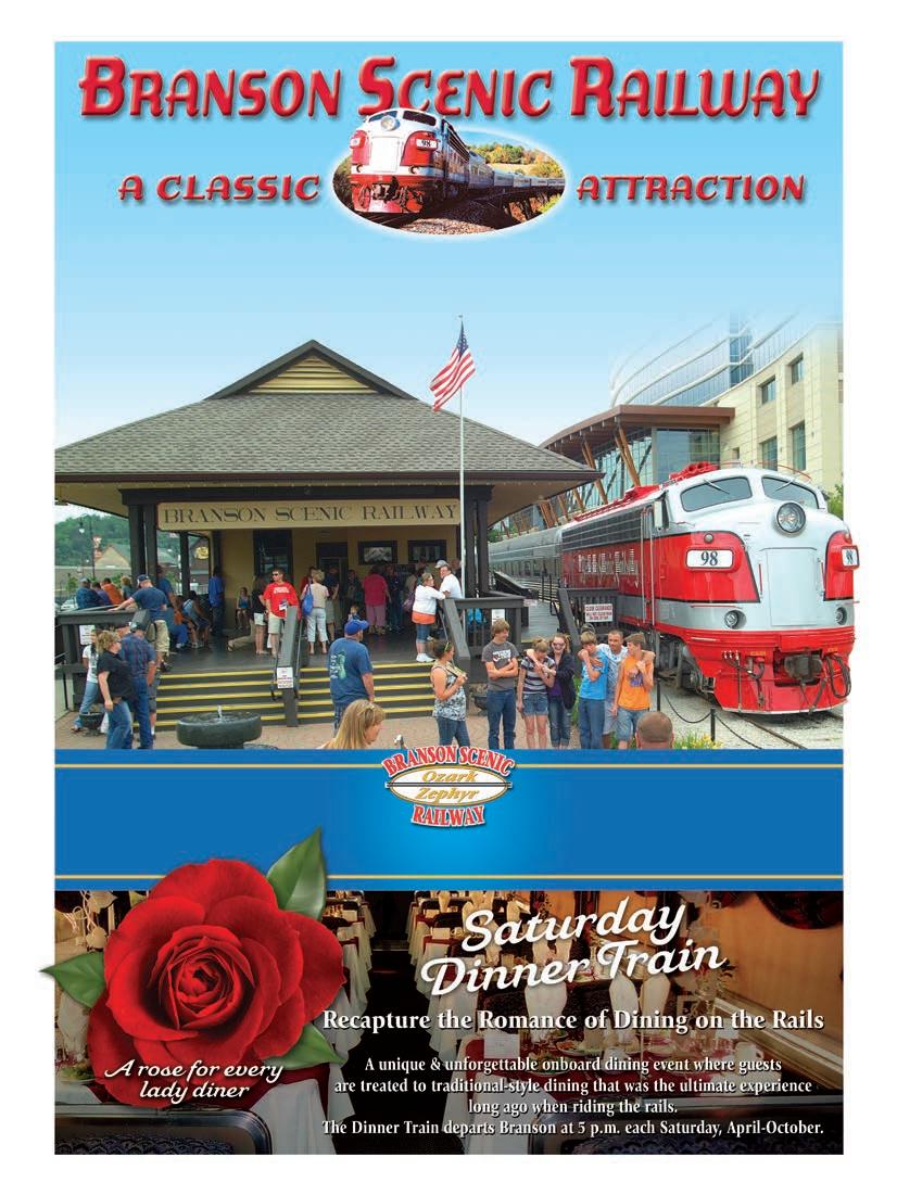 For the ultimate in nostalgic train experiences, Branson Scenic Railway features a four-course candlelight meal on their Saturday Dinner Train. Meals include your selection of Beef, Roasted Chicken or Fish and are accompanied by an appetizer, salad, vegetable, dessert and beverage. The Saturday Dinner Train departs at 5 p.m. each Saturday evening, April through October.