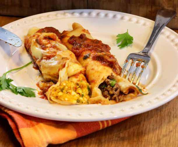 Use uma espátula, vá soltando a panqueca pelas bordas e então vire para que ela doure do outro lado. Recheie com o que quiser, como carne moída ou legumes. Passe para uma travessa, cubra de molho, polvilhe de queijo e leve ao forno para gratinar de leve.
