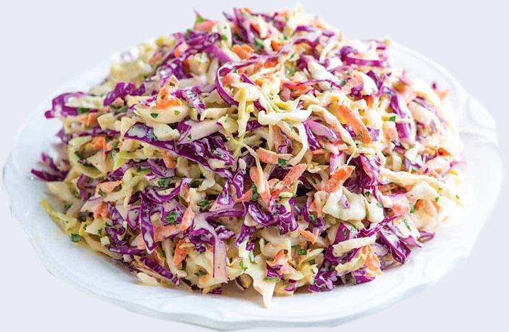 1 repolho roxo orgânico fatiado; 1 beterraba orgânica; ½ xícara (chá) de uvas-passas pretas; ½ xícara (chá) de maionese; ¼ de xícara (chá) de vinagre de maçã; 2 colheres (chá) de sal; Salsinha.