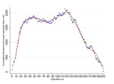 Retrospektiv gjennomgang av anonymiserte og avidentifiserte prospektivt registrerte data i operasjonsplanleggeren OpPlan ved St. Olavs hospital. Inngrep utført fra og med 1999 og til og med 2021 er registrert. Inngrep definert som mindre kirurgiske inngrep samt terapeutiske og diagnostiske prosedyrer i prosedyreliste for generell kirurgi (gammel ordning) er ekskludert. Inngrep fra kapittel A, C, D, E, F, L, M og T fra Norsk klinisk prosedyrekodeverk er ekskludert da disse ikke inngår i spesialiteten generell kirurgi og tilhørende subspesialiteter. Inngrep er registrert på hovedoperatør. Til sammen er over 80000 inngrep inkludert. Disser er utført av 317 ulike operatører. Operatører er klassifisert i tre; 1: assistentlege i utdanning uten spesialitet, 2: konstituert overlege uten spesialitet og 3: godkjent spesialist. Klassifikasjonen er basert på dato for inngrep kombinert med dato for ansettelse i stilling som konstituert overlege eller overlege med godkjent spesialitet.