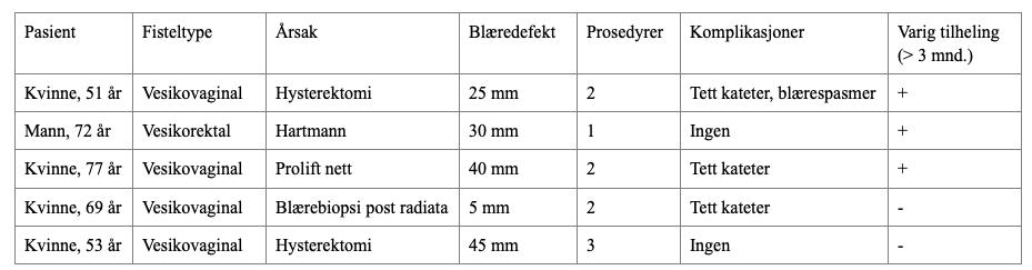 Det ble utført totalt ti prosedyrer på fem pasienter. Tre av fem oppnådde varig tilheling av fistel etter en eller to prosedyrer. Hos pasient med størst blæredefekt ble tre prosedyrer forsøkt uten å oppnå tett tilheling. To prosedyrer ble utført på liten defekt ved strålecystitt uten varig tett tilheling. Denne pasienten var etter begge prosedyrer tett ved cystografi ved 4 uker og deretter kateterfri og klinisk tett i 4-6 uker før residivlekkasje oppstod.