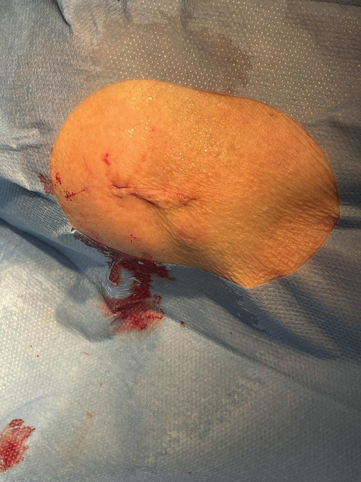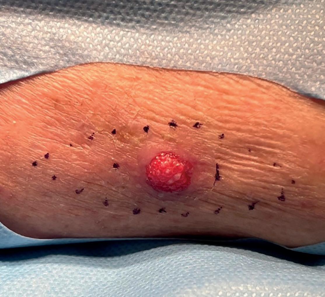 2. Eksempel på opptegning hvor lesjonen er definert (stiplet linje), deretter ønsket margin (kontinuerlig linje) og til slutt en fusiform incisjonslinje som tangerer ønsket margin. Bemerk hudens folder. Pasienten har gitt samtykke til bruk av bildet.