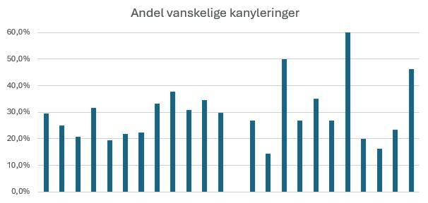 1 Pasientrapporterte smerter under en koloskopi I 2023 opplevde 27,4 % av pasientene som rapporterte etter en koloskopi til Gastronet sterke eller moderate smerter til tross for en økende andel som ble premedisinert med analgetika og/eller sedativa. Kvinner (36,7 %) var overrepresentert i denne statistikken. Figur 2 viser variasjonen av rapporterte sterke smerter avhengig av utførende endoskopør. Ytterpunktene i denne variasjonen lå på hhv. 0,7 % og 44,4 % med sterke smerter. Variasjoner i pasientkarakteristika (case mix) kan ha en innflytelse her, men vi vet at endoskopørferdigheter spiller en overordnet rolle. Vi vet også at aktive forbedringstiltak av endoskopiferdigheter senker pasientandelen med smerter (1).