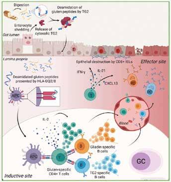 Gluten er et særegent protein med svært mange prolamin- og glutaminresiduer. Når disse proteinene fordøyes, brytes de ned til korte, mellomlange og lange peptidkjeder inkludert et 33 aminosyrer-langt fragment. Glutaminresiduer i disse kjedene kan modifiseres til glutaminsyre ved enzymet transglutaminase 2. Dette skjer sannsynlig i lumen, og gir såkalte deamiderte glutenpeptider. Det