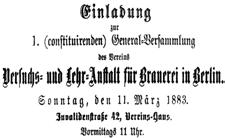 Landwirtschaftlichen Institut in der Dorotheenstraße. Am 11. März 1883 wurde die erste Generalversammlung abgehalten (Einladung siehe Abbildung). Dort wurde Richard Roesicke, Generaldirektor der Berliner Schultheiss-Brauerei, zum ersten Vorsitzenden des Vereins gewählt. Die VLB expandierte schnell: Am Ende des ersten Gründungsjahres hatte sie bereits 150 Mitglieder. Der Platz wurde knapp, sodass man 1884 gemeinsam mit den Spiritusfabrikanten und dem Verein der Stärkeinteressenten in ein neues Laboratoriumsgebäude auf dem Gelände der Kgl. Landwirtschaftlichen Hochschule an der Invalidenstraße in Berlin-Mitte umzog. Im selben Jahr erschien die erste Ausgabe der „Wochenschrift für Brauerei“.