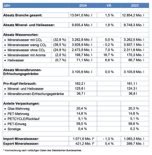 (F.) Mit einem Pro-Kopf-Verbrauch von 125,6 l ist Mineralwasser einer der wichtigsten Flüssigkeitslieferanten der Menschen in Deutschland. Der Gesamtabsatz der Mineralbrunnenbranche bezogen auf Mineralwasser, Heilwasser und Mineralbrunnen-Erfrischungsgetränke ist 2024 um 1,5 % auf insgesamt 13 Mio. hl gestiegen.